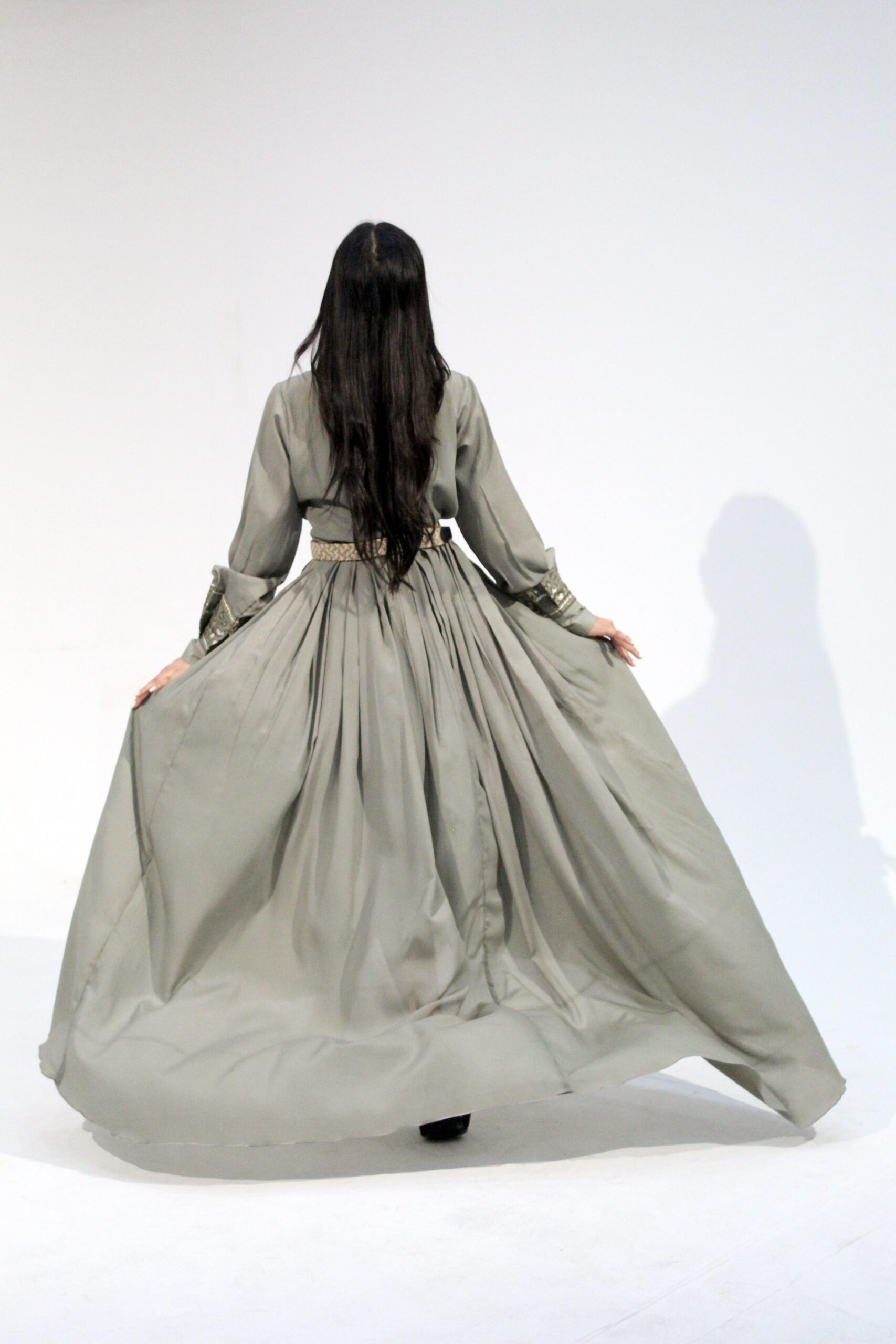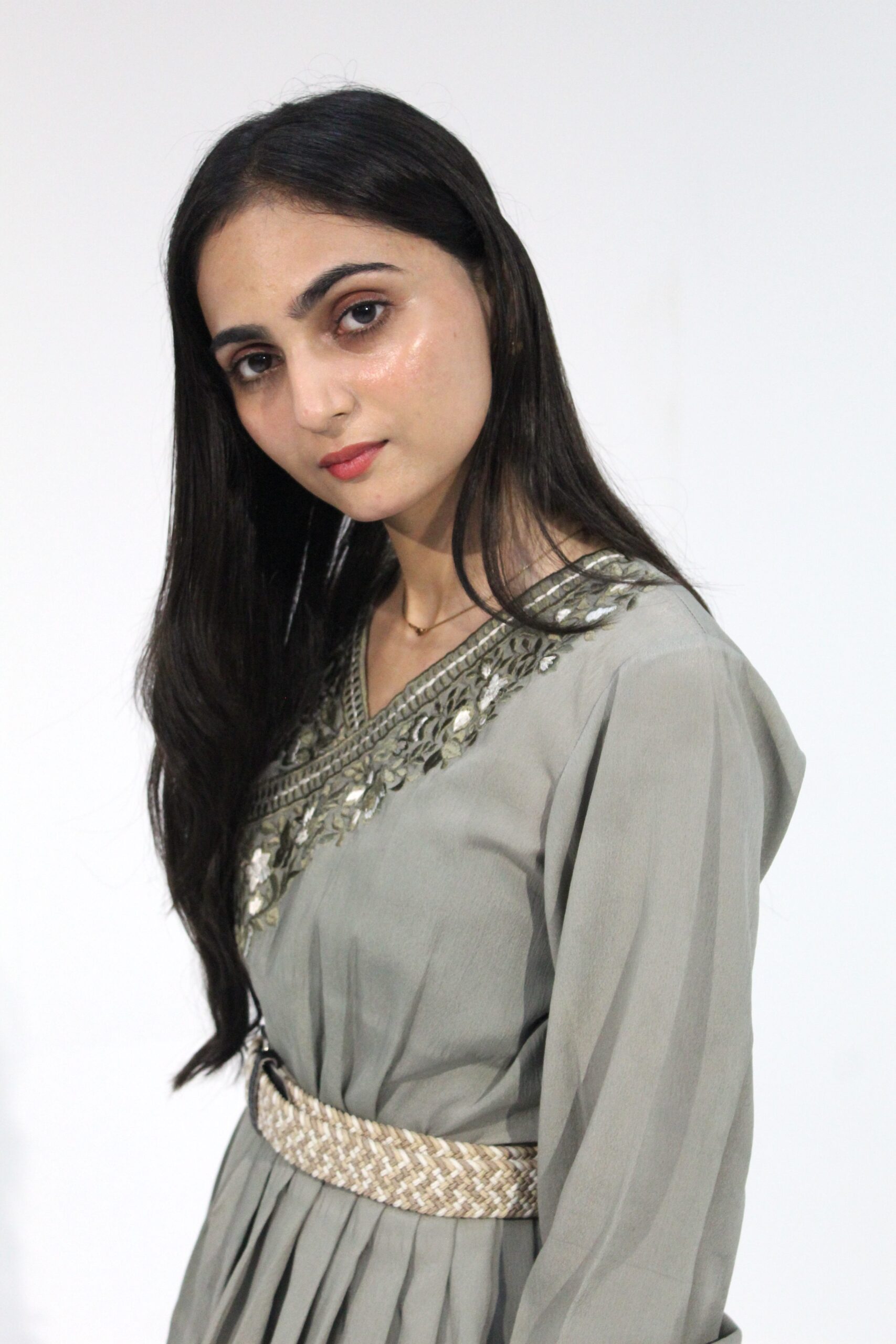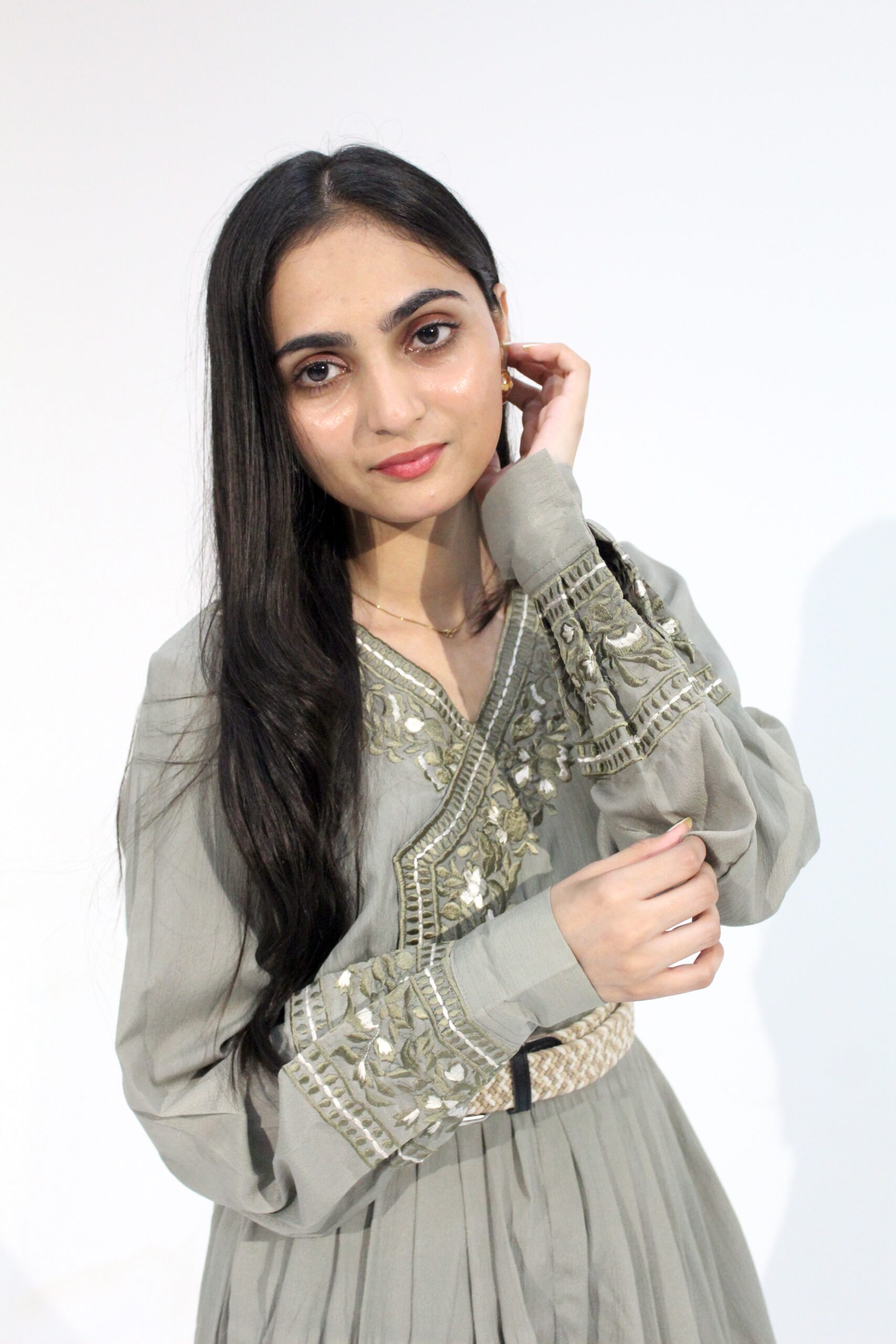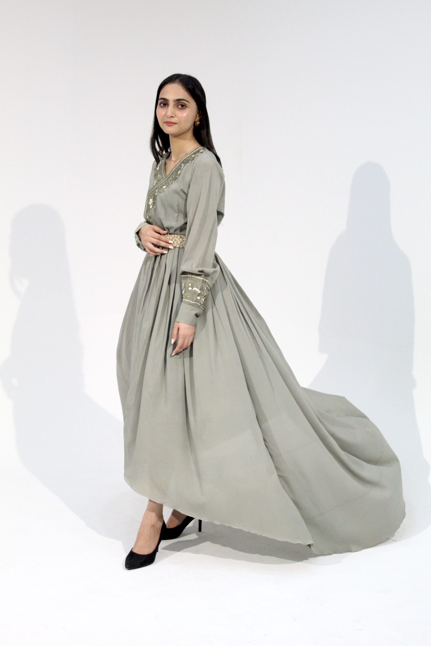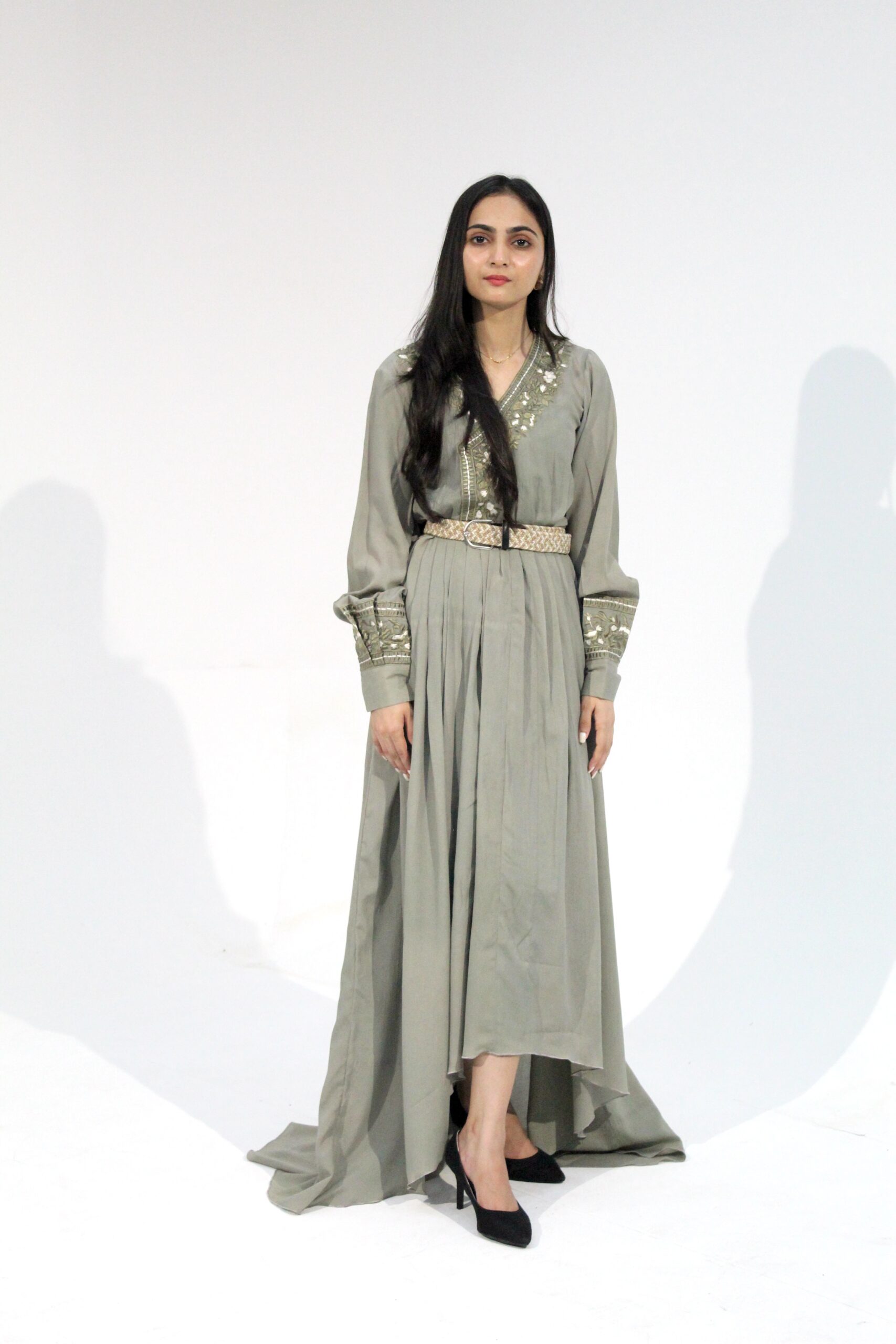 This sage-green soft-crepe frock comes with a wide, flowy silhouette, a delicately embroidered V-neckline, and full embroidered cuffs. The patterned waist belt pulls the shape together without killing the airy movement. It’s lightweight, breathable, and works well for semi-formal events or any day you want a polished, effortless look. Hand wash gently or dry clean to keep the embroidery intact.